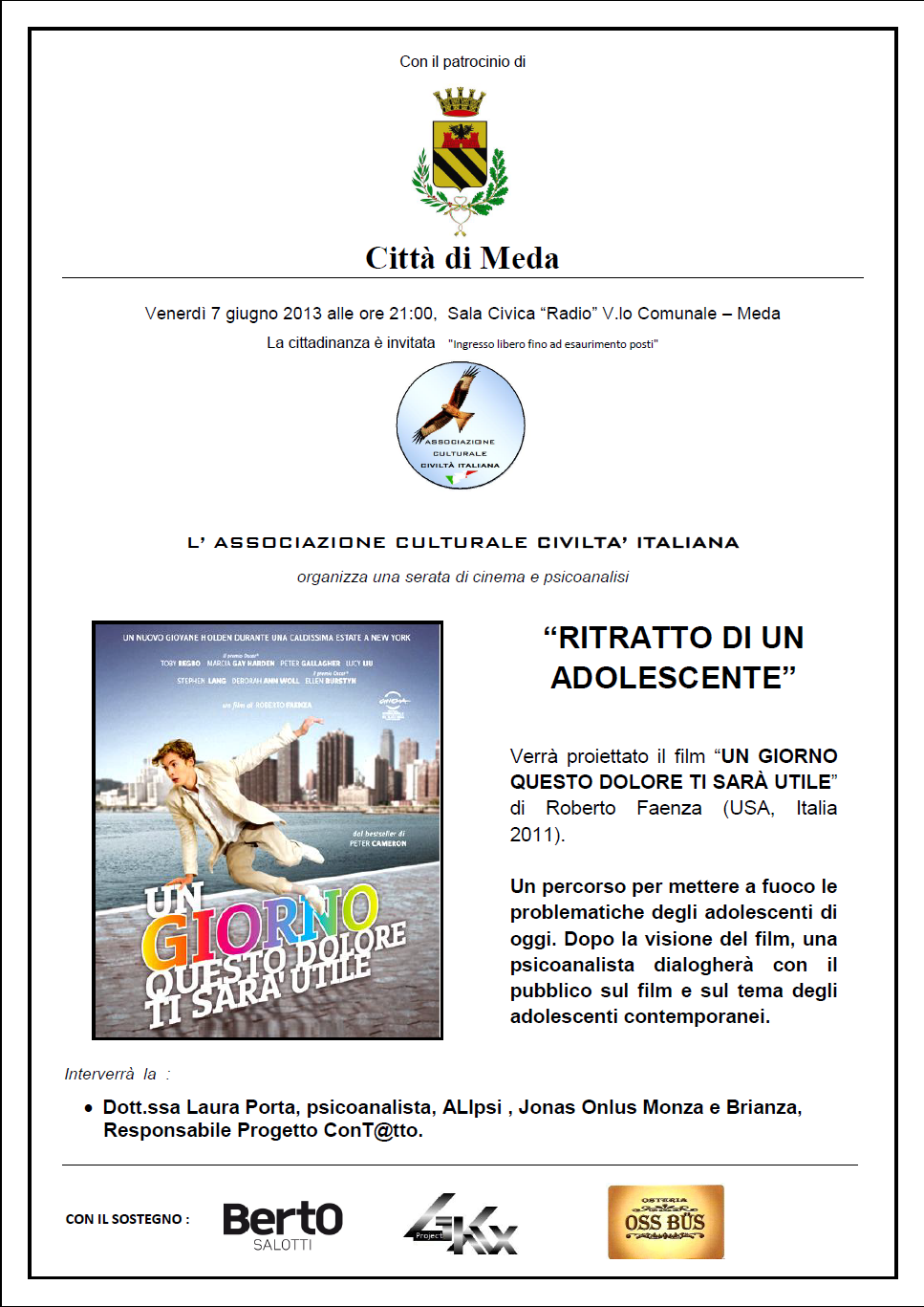 Venerdì 7 giugno alle ore 21, presso la Sala Civica “Radio”, a Meda, la Dott.ssa Laura Porta sarà ospite dell’Associazione Culturale Civiltà italiana all’evento: “Ritratto di un adolescente”. Ci sarà la proiezione del film “Un giorno questo dolore ti sarà utile”, di Roberto Faenza. In seguito la Dott.ssa Laura Porta, dopo un breve intervento, dialogherà con il pubblico sul film e sul tema dell’adolescenza contemporanea.