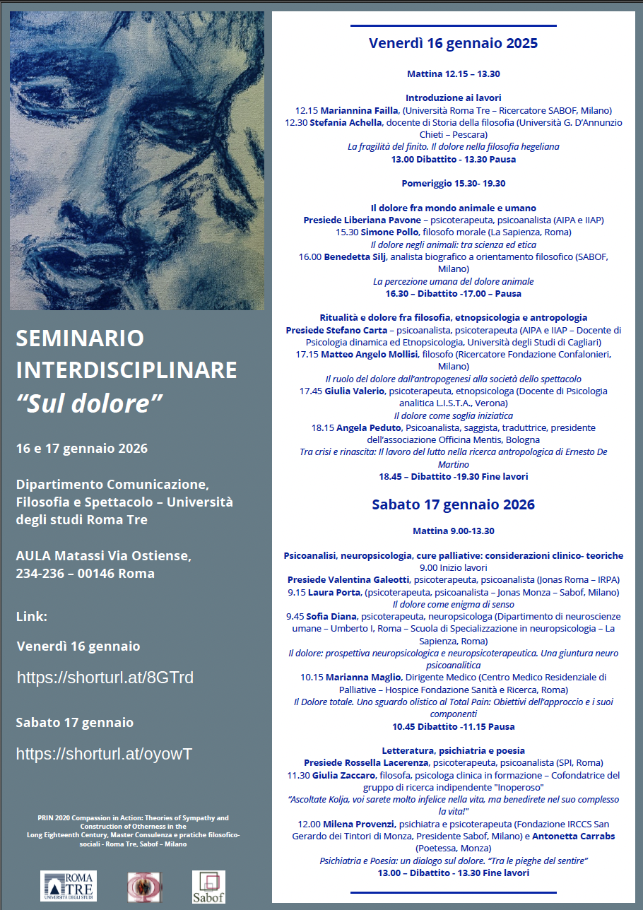 Sabato 17 gennaio la Dott.ssa Laura Porta parteciperà al SEMINARIO INTERDISCIPLINARE “Sul dolore” con un intervento dal titolo: “Il dolore come enigma di senso”. Il convegno si svolge presso il Dipartimento Comunicazione, Filosofia e Spettacolo – Università degli studi Roma Tre, Aula Matassi, Via Ostiense 234-236, Roma. La partecipazione è libera e gratuita, in presenza oppure da remoto ai link: