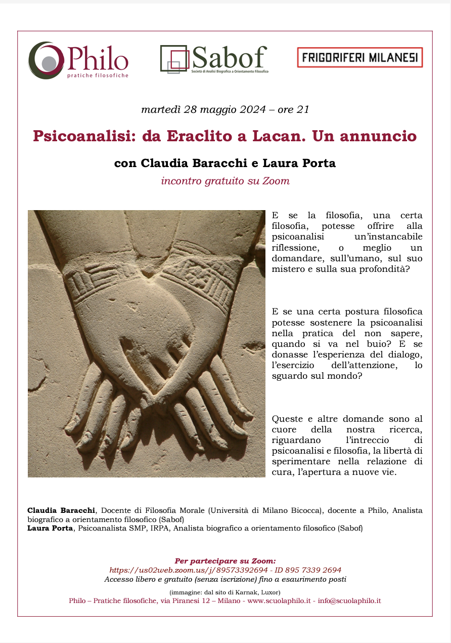 E se la filosofia, una certa filosofia, potesse offrire alla psicoanalisi un’instancabile riflessione, o meglio un domandare, sull’umano, sul suo mistero e sulla sua profondità?